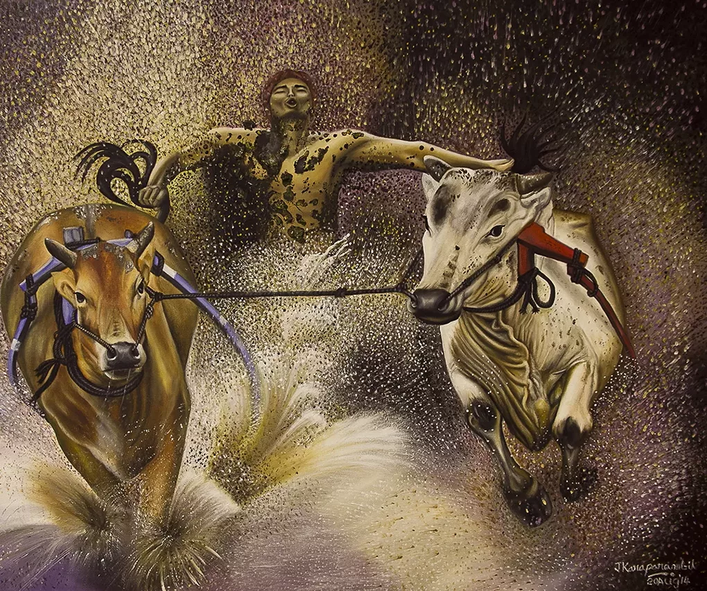 In this electrifying artwork, Joseph Karaparambil captures the raw power, energy, and cultural intensity of a traditional bull race, inspired by an internationally acclaimed photograph by WS Chen of Malaysia. With an eye for detail and a masterful hand, Karaparambil transforms the fleeting moment of the race into a timeless visual spectacle.
